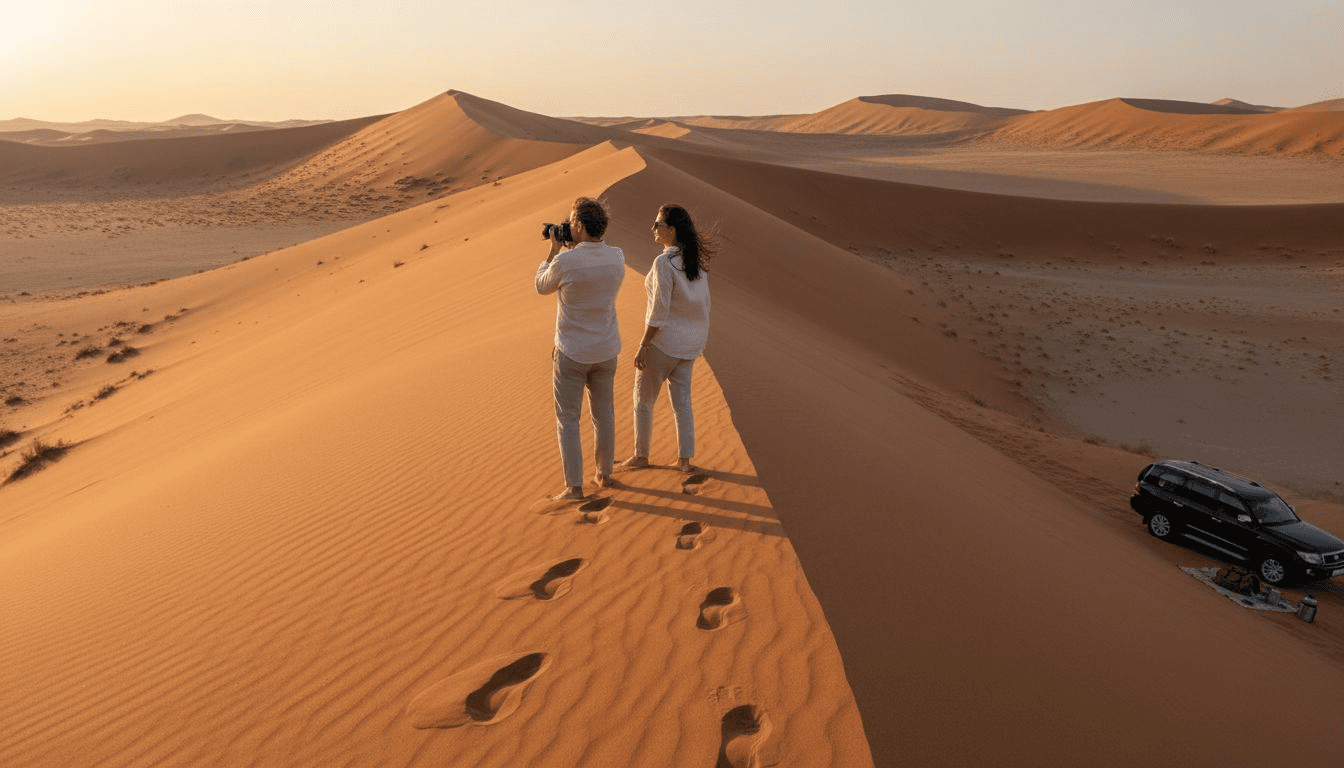 Algunas experiencias imperdibles para parejas incluyen survolar el desierto en un vuelo panorámico privado, tomar un safari fotográfico exclusivo o disfrutar de cenas románticas montadas especialmente en medio de paisajes desérticos con iluminación por antorchas.